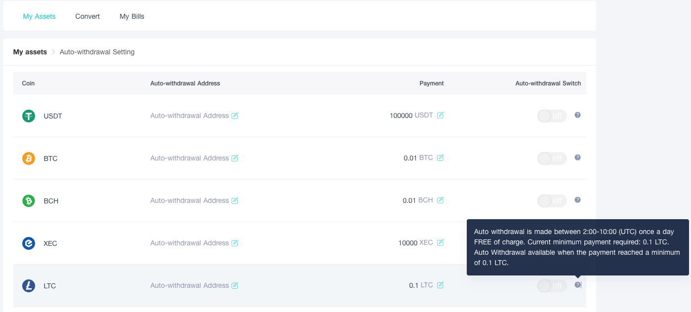 Click on "Auto-Withdrawal Setting" to set an Address for the crypto that will be automatically sent to your own wallet or to your CoinEX address. Auto withdrawal will only happen based on the limit that you set. For example, LTC rewards will be automatically withdrawn when it reaches 0.1 LTC.