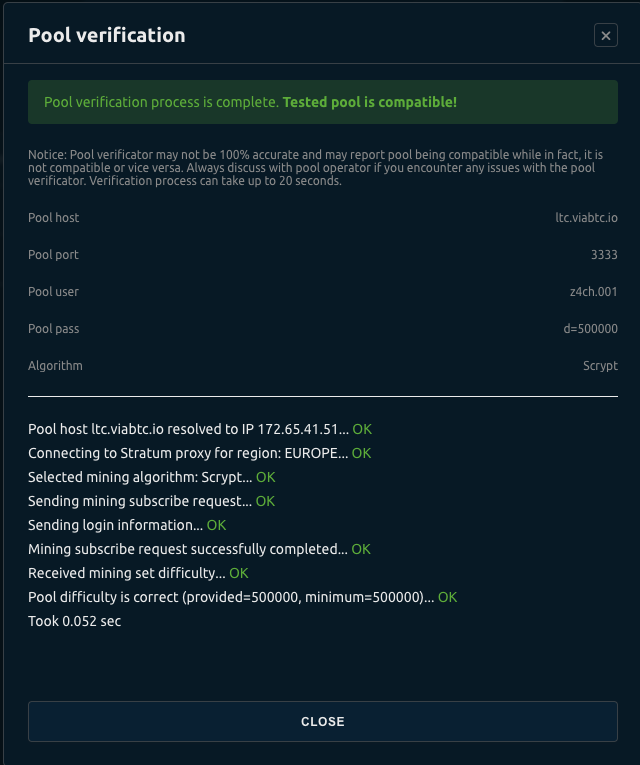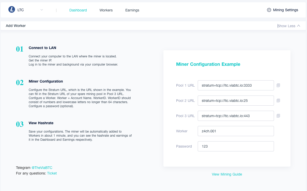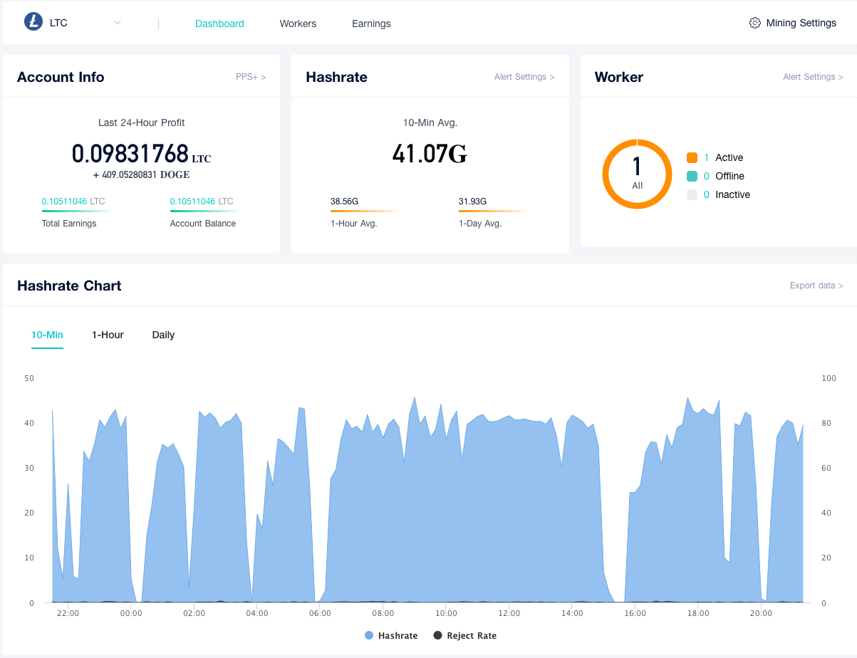 Congratulations, you are now mining Litecoin including Dogecoin and Bellscoin. You can also monitor progress of your miner/worker on ViaBTC and see estimated rewards.