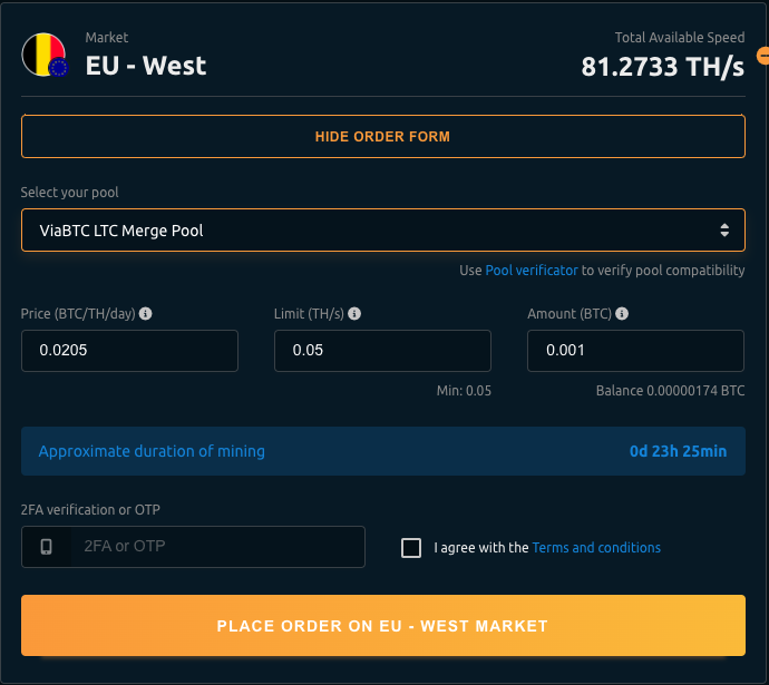 Choose between EU and USA locations. If you are going to use a mining pool that is located in the EU, then it would be best to choose a miner in the same location. Click on + New Order and fill up all the required details. This is where you need to set the information that you got from [ViaBTC](https://www.viabtc.com/signup?refer=1777107).