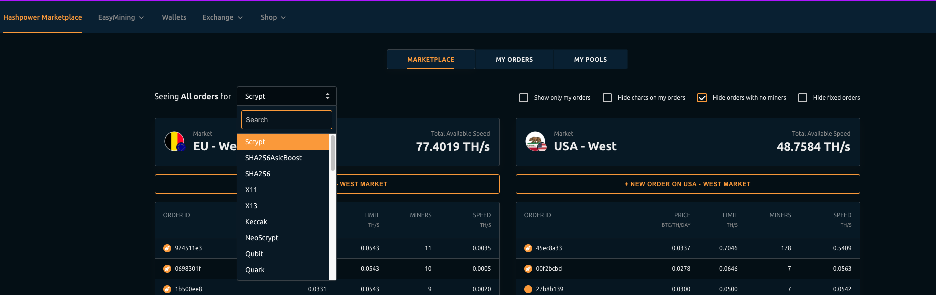 Click on the Hashpower Marketplace, and select Scrypt.&#x20;